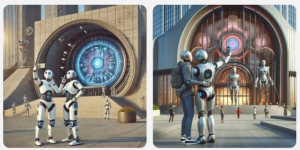 その Image Creatorの生成画像が、ここ最近プロンプトに沿ったものとならない。例えば、直前の記事「ファサード#3」のアイキャッチは「コンセプトアート、近未来の美術館の入り口の前でセルフィーを取る観光客のロボット2体、ファサード」というプロンプトで生成し、以前は下のような画像が出力された。